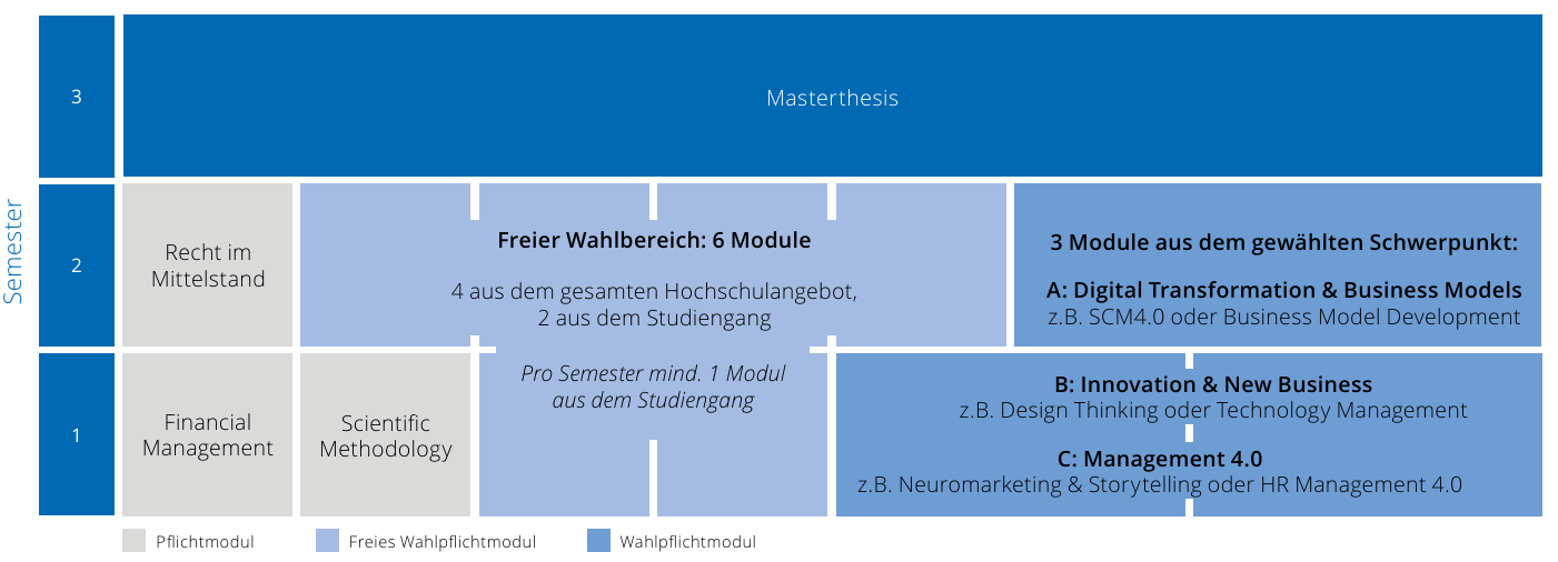 Professional experience is helpful, but not essential due to the consecutive structure of the master's program. The master's program in SME Management is a full-time program lasting three semesters. In the third semester, students write their master's thesis, in which they solve practical problems in business management using scientific methods.